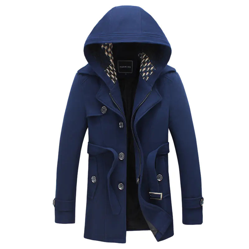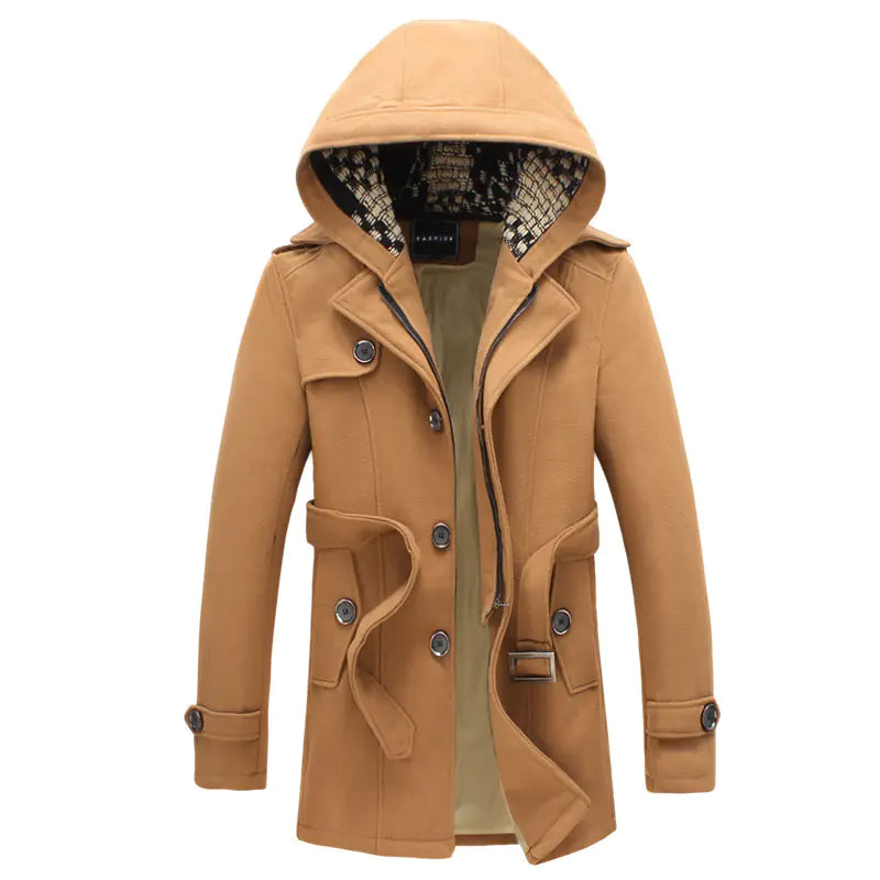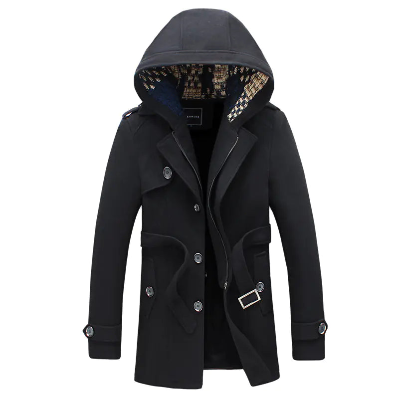 Elevate your style with our Men's Short Trench Coat Hooded. This versatile piece features a classic lapel collar and a practical hood, making it perfect for both casual and formal occasions. The single-breasted front placket with a buckle adds a touch of sophistication, while the thick fabric ensures warmth and comfort even on chilly days.